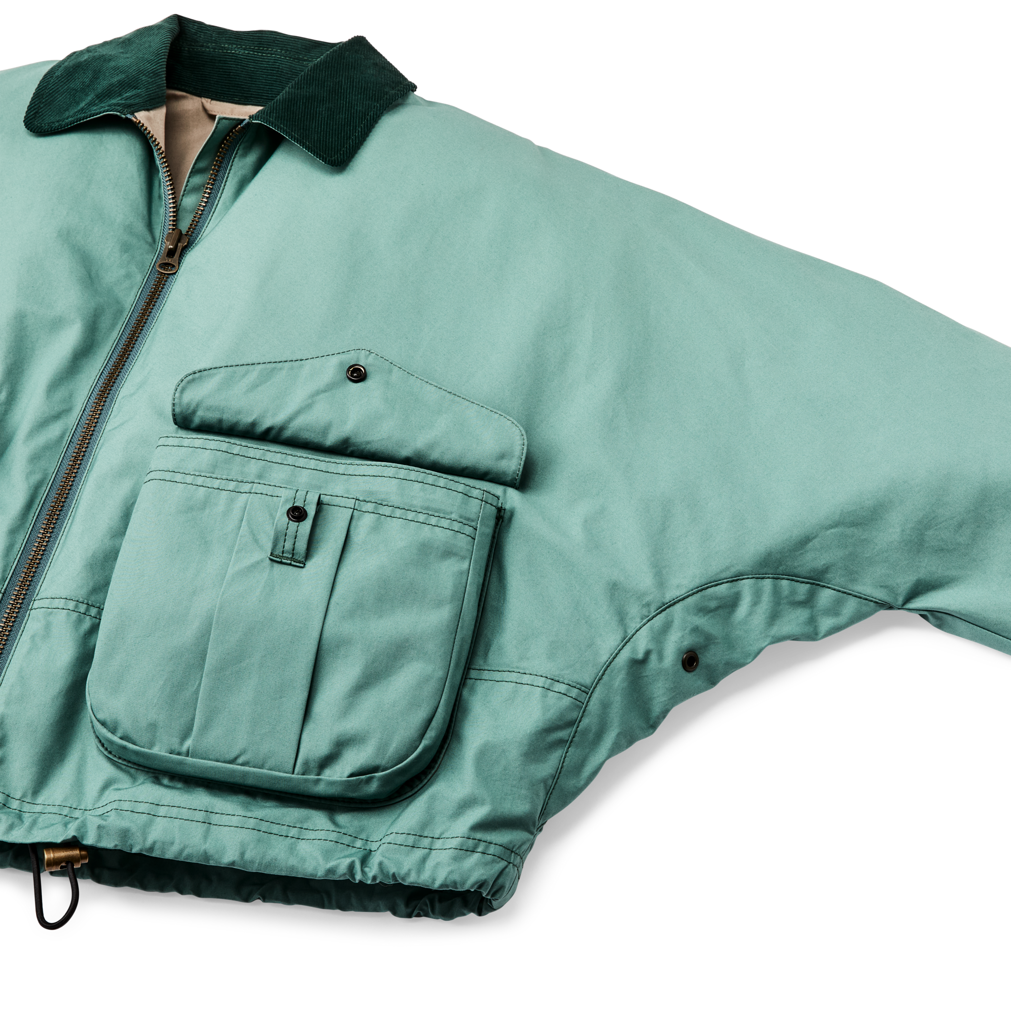 Inspired by the design of our vintage fishing jackets. this lightweight hip-length jacket is ideal for mixed spring weather. The 100% cotton Aviator fabric from England’s famed historic British Millerain is virtually windproof and treated for water resistance. In a nod to tradition. the caped shoulder construction eliminates exposed seams for improved weather protection. The cargo pockets are expandable to fit beanies or gloves and feature hidden hand pockets. The torso is lined with cotton and the sleeves with easy-layering polyester. A snap-tab throat latch seals out the wind at the collar. Cotton corduroy-lined collar.