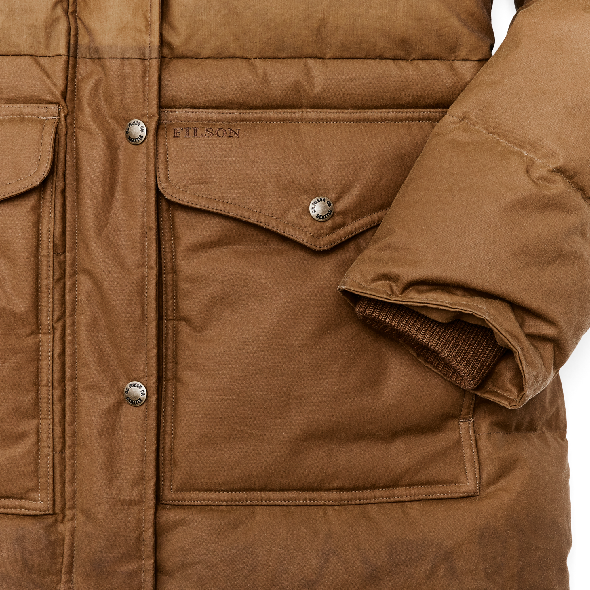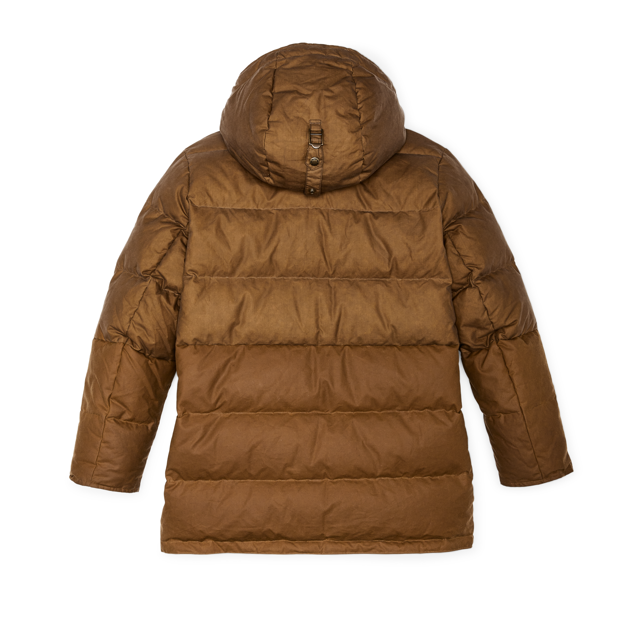 Modeled after vintage arctic parkas. this lightweight coat is made for comfort in frigid weather. The dry-waxed cotton shell turns away rain. wind. and snow. It’s filled with duck down. some of nature’s lightest and warmest insulation. The drawcord-adjustable hood is large enough to fit over caps. and lined with comfortable cotton twill. The sleeves feature interior rib-knit cuffs made from a wool blend to seal in the warmth. The body is lined with lightweight cotton and the sleeves with easy-layering polyester twill. Interior and exterior storm guards protect the front two-way zipper from icy winds.